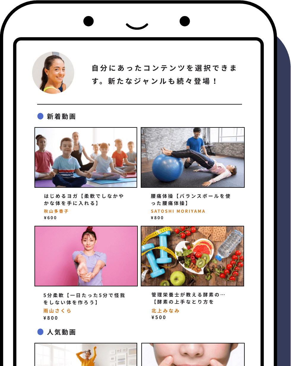 例えばヨガ、ピラティス、朝に最適なストレッチにランニング、ちょっとした運動から筋力トレーニング、ダンス、スキマ時間でできる顔やせ体操に姿勢改善、長期的・短期ダイエットや栄養学、さらに健康・医療の部門、運動療法まで、その道のプロが講師としてつくった動画が続々と追加されます。