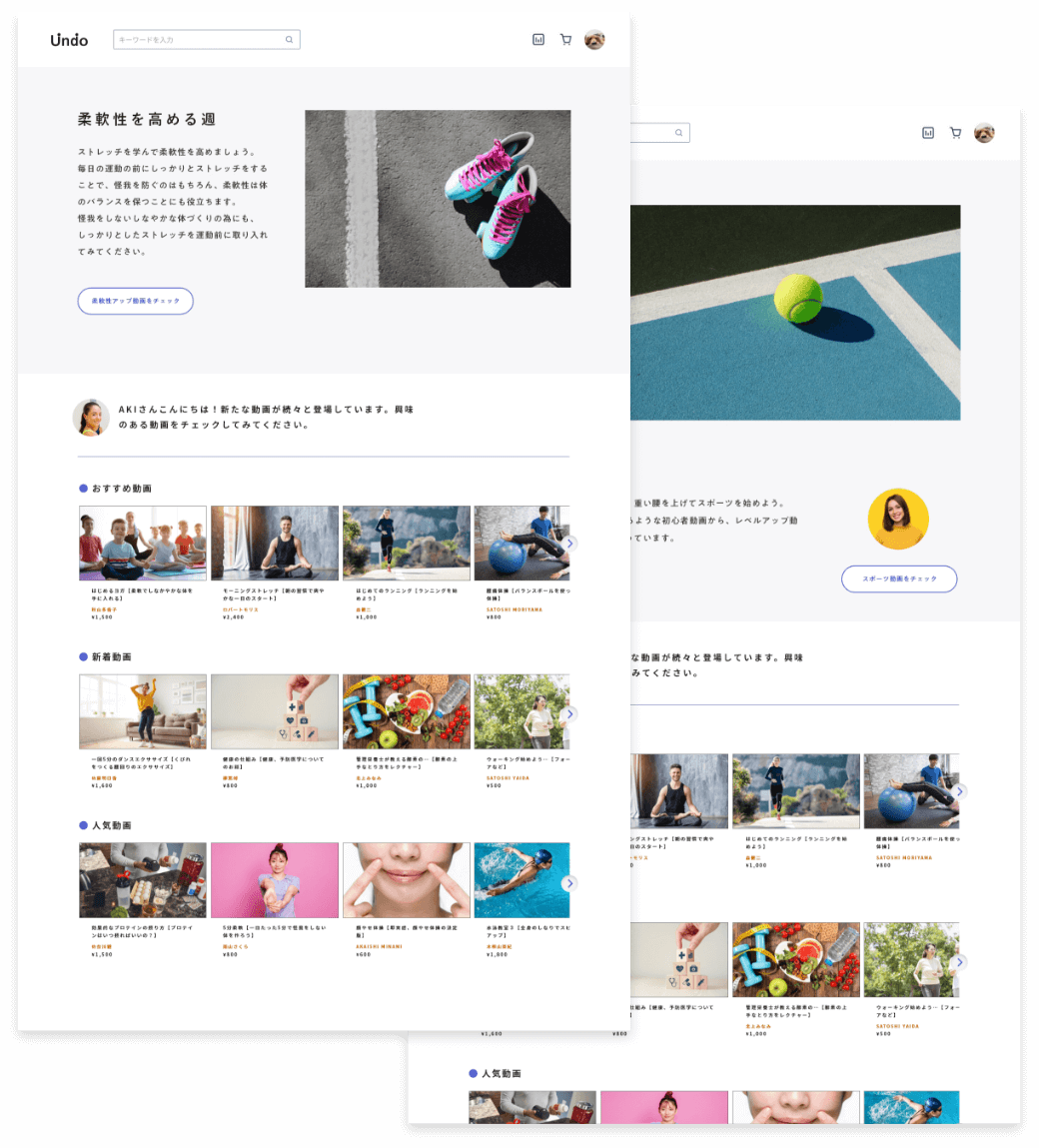例えばヨガ、ピラティス、ストレッチにランニング、ちょっとした運動からハードな筋トレ、スキマ時間でできる顔やせ体操、さらに健康・医療の部門まで、その道のプロが講師としてつくった動画が沢山。好きな時間に、好きな場所で、周りを気にすることなく好きなだけ運動をする。時間や場所に縛られない自由で新しいコミュニケーションとライフスタイルを支えるため、Undo(ウンドゥー)が厳選したプロの講師たちが、質の高い動画コンテンツを用意して、皆様をお待ちしています。